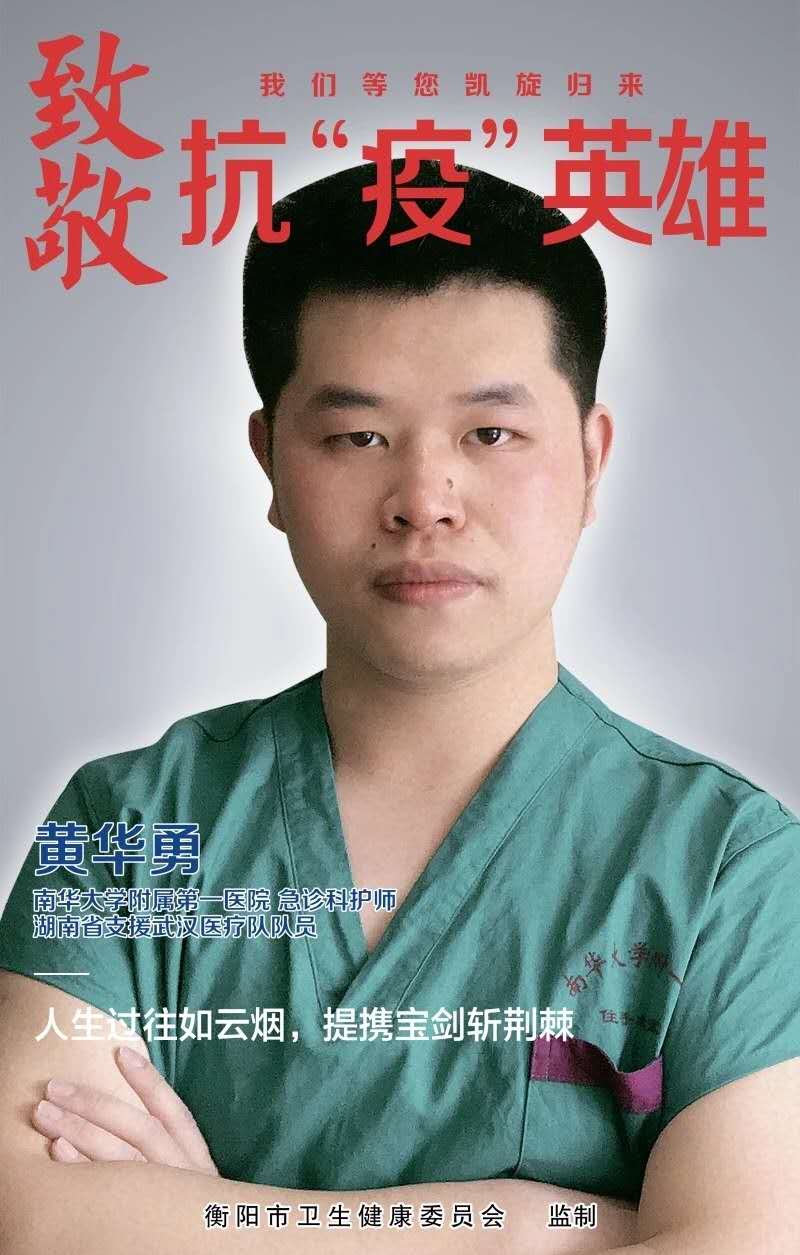 2138CC太阳集团2019级硕士研究生黄华勇,是2138cc太阳集团附属第一医院的急诊科护师,几小时前临危受命,他成为了前线队伍中的一员。得知即将前往湖北支援的消息,电话那端传来哽咽的声音并嘱咐道:“一定要沉着冷静,没把握的事多问,胜利在望,平安归来,家里一切都好,勿劳挂。”有了家人的支持,他便踏上了前进的征程。“一定要平安归来,再聚之时,定要不醉不归”一句句暖心的话语不断在耳边响起,希波克拉底誓言,南丁格尔思想,驱散了他内心的恐惧。他说“真的猛士敢于直面惨淡的人生,敢于正视淋漓的鲜血。此刻,我应该是一个真正的猛士!”并在自己日记中写到: