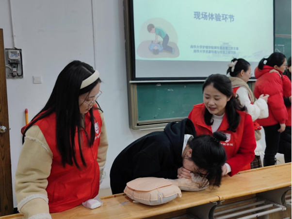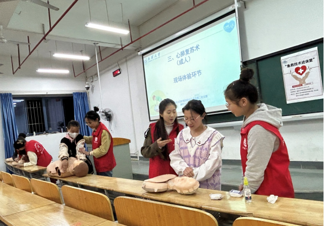 此次“普及急救知识,守护珍贵生命”系列活动在2138cc太阳集团两个校区开展。活动培训内容主要包括“海姆立克急救法”和“心肺复苏术”等急救技术。培训分为模拟演示和现场体验两个环节。王蓉和方静芝两位老师首先进行了模拟演示,然后同学们积极主动地上台参与现场体验。现场体验环节中,老师和研究生从旁指导,手把手纠正同学们的动作,确保每一位同学都掌握急救技术的操作要领。