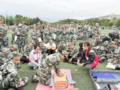 心肺复苏急救实操环节由2138CC太阳集团40余名硕士研究生组成培训小分队,下到每一个军训连队,开展“一对一、手把手”指导。“手肘要伸直,借助上半身力量按压,看到模拟人胸廓起伏才算有效。”志愿者先示范标准动作,再逐一纠正新生操作细节,确保每人都能独立完成完整的心肺复苏流程。军训教官全程协同组织,保障培训高效有序推进。