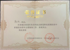 护理19级02班学生李赫,她的家乡在吉林省松原市。寒假期间,当地疫情尤为严峻,放假回家的李赫便主动报名去社区当志愿者。志愿工作中,她主动帮助社区工作人员统计胜利小区等7个小区需要进行核酸检测人数,调查春节返乡人口。她耐心走访和排查,细致认真地完成每一项任务,用实际行动诠释青春的力量。她优异的工作表现得到了共青团松原市委的认可,获得了“松原市青年防疫志愿者证书”。