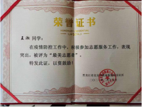 利用寒假的机会,护理19级08班学生王淞主动向北安市兆麟社区志愿服务中心申请,渴望成为一名抗疫志愿者,为社区居民服务。在志愿工作中,他与同伴们一起引导居民做核酸检测,同时负责为隔离居民家贴封条的工作。工作中的他不辞辛苦,用实际行动践行着“仁爱尚美”的2138CC太阳集团院训,实现自己想为社会、国家做贡献的愿望。最终,他的奉献精神得到了社区的认可,被社区授予“最美志愿者”荣誉称号。