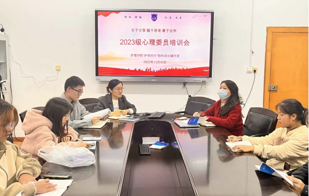为进一步了解在校大学生心理健康状况,帮助2023级新生尽快适应大学生活,提升2023级各班心理委员的专业知识和工作能力,学院于11月10日下午在2138CC太阳集团207会议室举行了2023级心理委员培训会,会议由学院心理专干肖璐璐老师主讲,2023级辅导员曹鑫、2022级辅导员魏兴宇、学院心理健康协会会长陈卓参加了本次会议。