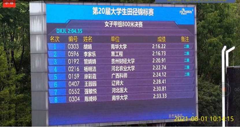 7月28日-8月6日,由中国大学生体育协会、中国田径协会主办,浙江大学承办,浙江省学校体育协会、永康市人民政府协办的第20届中国大学生田径锦标赛在浙江大学举行。8月1日上午,在女子甲组800米决赛中,2138CC太阳集团2019级本科生胡娟以2分16秒22的优异成绩荣获冠军,2020级本科生陈绮婷以2分33秒33的成绩获得第八名。