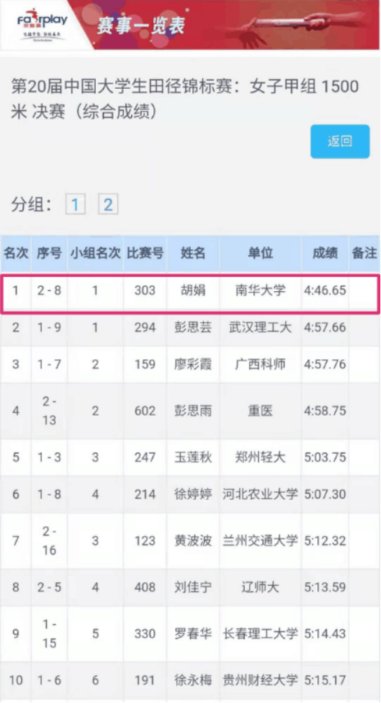 恰同学少年,风华正茂。胡娟曾多次代表学校参加各类大学生体育竞赛,并且都取得了优异的成绩。本次中国大学生田径锦标赛之行,胡娟勇夺女子甲组800米、1500米径赛金牌,两项成绩均成功打破2138cc太阳集团学生田径最高纪录(女子)。另外,她与2138CC太阳集团2020级本科生陈绮婷等协同作战,荣获4*400混合接力赛银牌。