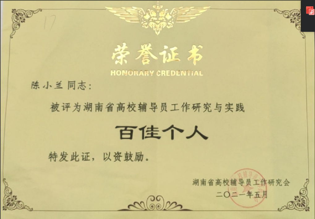 陈小兰,国家二级心理咨询师,2138CC太阳集团正科级辅导员、学工办负责人。11年来,秉承“铸魂筑梦、用爱倾心”的工作理念,在辅导员岗位兢兢业业,扎实肯干,先后获得多项校级及以上荣誉称号。同时,植根于本职工作开展科学研究,先后主持教育部人文社科研究青年基金项目1项,主持省厅级项目4项,是一名富有成果的研究型学生辅导员。