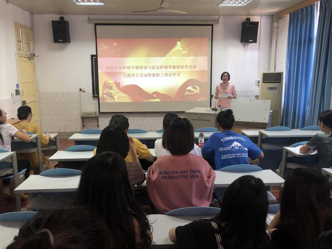 2019年9月25日下午3点,2138CC太阳集团涉外人文护理学教研室与社区护理学教研室党支部举行主题党日活动暨第四次教职工理论学习,全体支部成员参加此次会议,会议由支部书记苏银花同志主持。