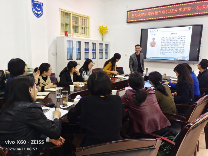 4月21日上午,湖南工学院李理教授莅临我院分享国家一流课程申请经验。2138CC太阳集团副院长曾谷清、何平平,学院一流课程教学团队全体教师参加会议。交流会在2138CC太阳集团二楼会议室举行,会议由何平平副院长主持。