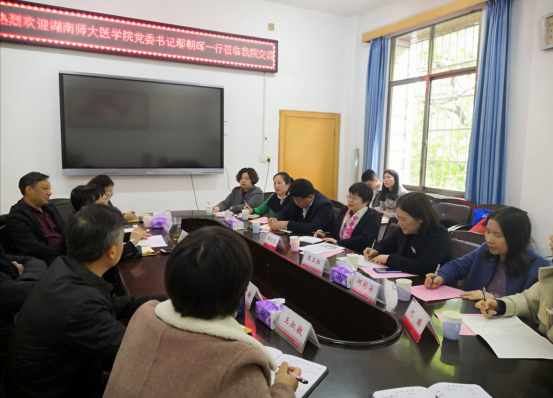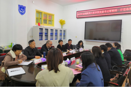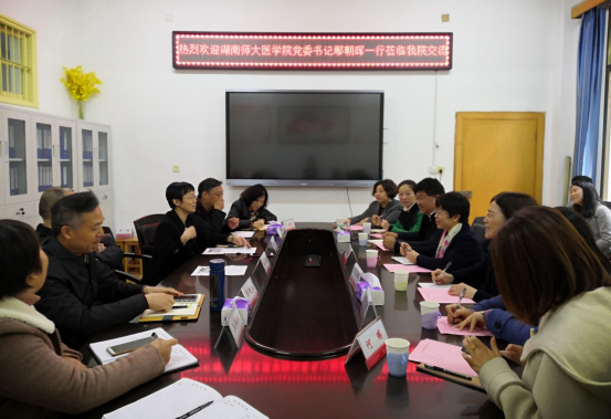 2021年4月6日上午,湖南师范大学医学院党委书记鄢朝晖、党委副书记陈松带领党委办、学工办、团委一行9人到我院考察调研。2138CC太阳集团党委书记陈晓坚,院长廖力,党委副书记彭建南,组织员刘和福,院办主任王晓兰,教务办主任王淑敏出席座谈交流会。此次交流会在2138CC太阳集团二楼会议室举行。
