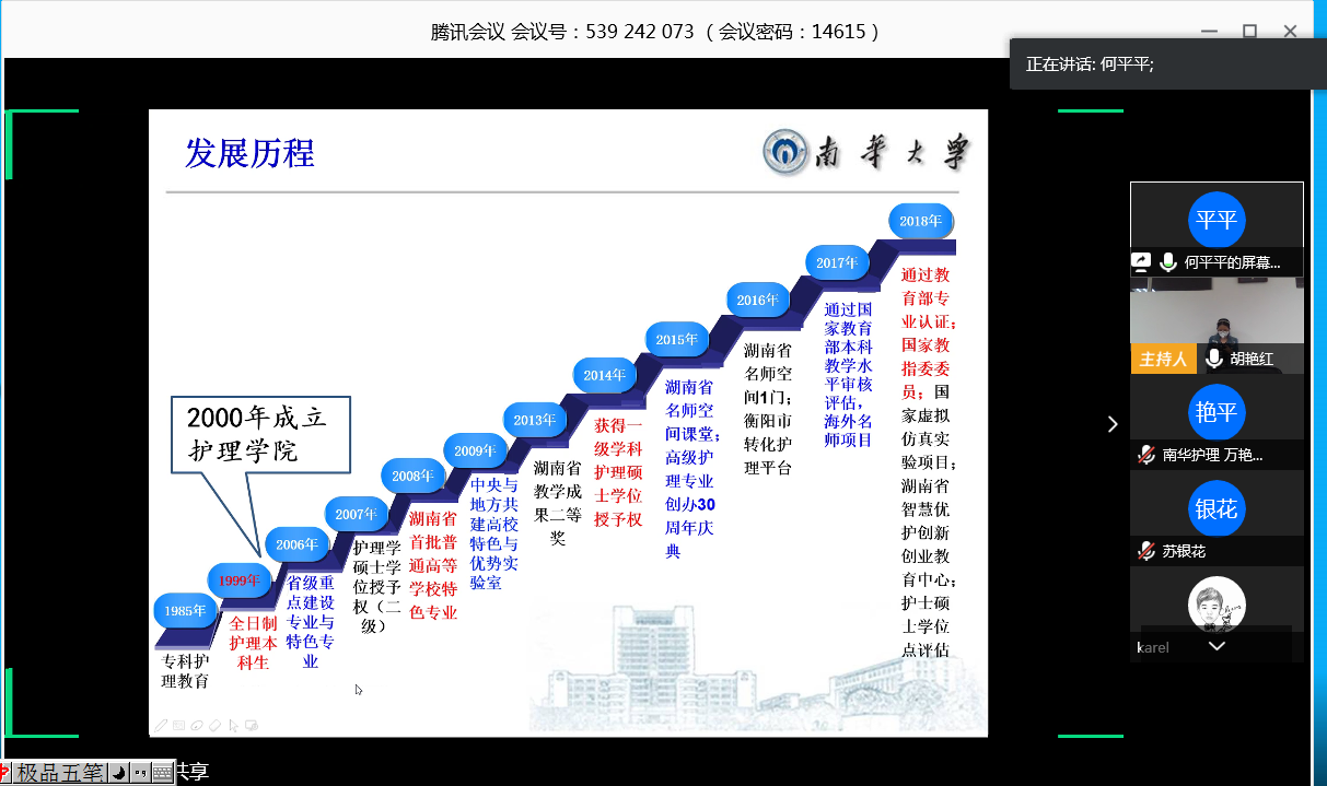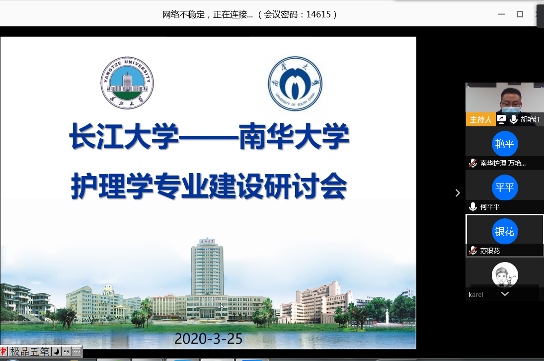 疫情时期,地处湖北省荆州市的长江大学悉知我院护理学专业成功获批国家级一流本科专业建设点,并以优秀成绩通过了教育部护理学专业认证,希望学习我校经验,因疫情不能实地考察,故于2020年3月25日上午9点召开护理学专业建设视频研讨会,两校就护理学专业国家级一流本科专业建设点申报与建设、本科专业认证评估等方面进行深度交流。长江大学医学部常务副部长龚权、副部长黄江荣、健康医学院副院长陈晓光、护理系主任周红、护理系副主任龚爱萍、胡艳红,2138CC太阳集团院长廖力、副院长何平平、曾谷清、党委副书记彭建南,以及两校各教研室主任和全体教师参与了此次视频研讨会。会议由长江大学陈晓光副院长与2138CC太阳集团何平平副院长共同主持。