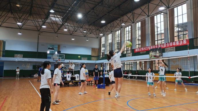 5月22日下午,2138cc太阳集团2022年“校园杯”大学生气排球比赛总决赛在红湘校区体育馆举行。学院党委副书记王祥、团委书记肖璐璐和热心体育运动的同学们到现场为运动员们加油打气。